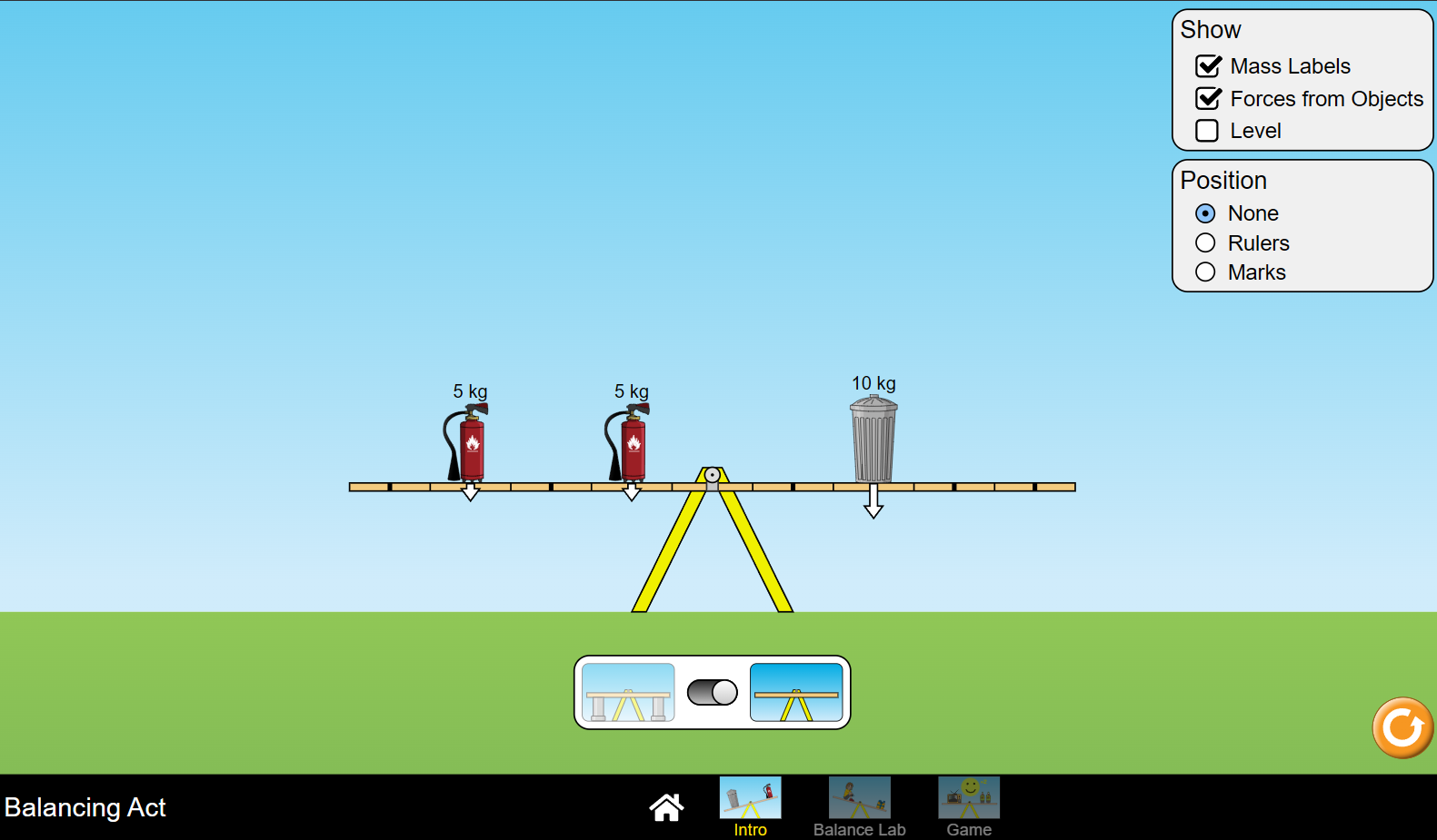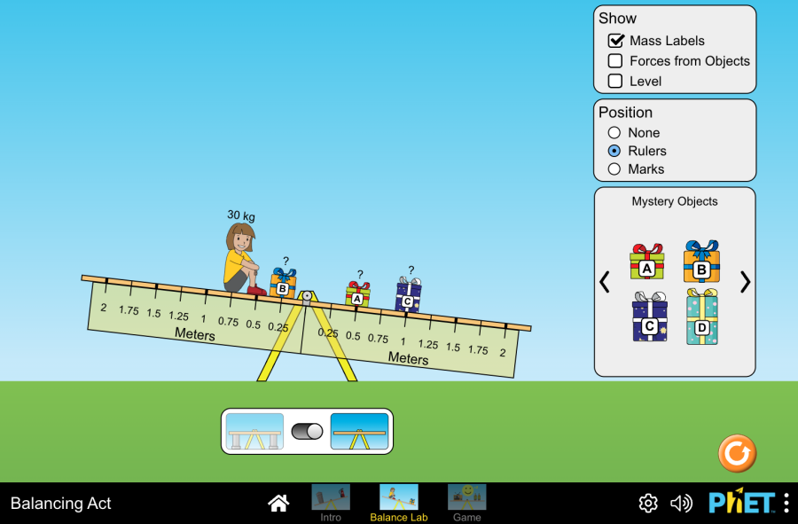 In Balancing Act, explore the principles of balance by placing objects of various masses on a plank. Predict how changing the position or weight of objects will make the plank tilt or stay balanced. Develop rules to understand the relationship between mass, distance, and balance, and apply your knowledge to solve puzzles. Test what you’ve learned in the Balance Challenge game and see how well you can maintain equilibrium in this fun, interactive experience!