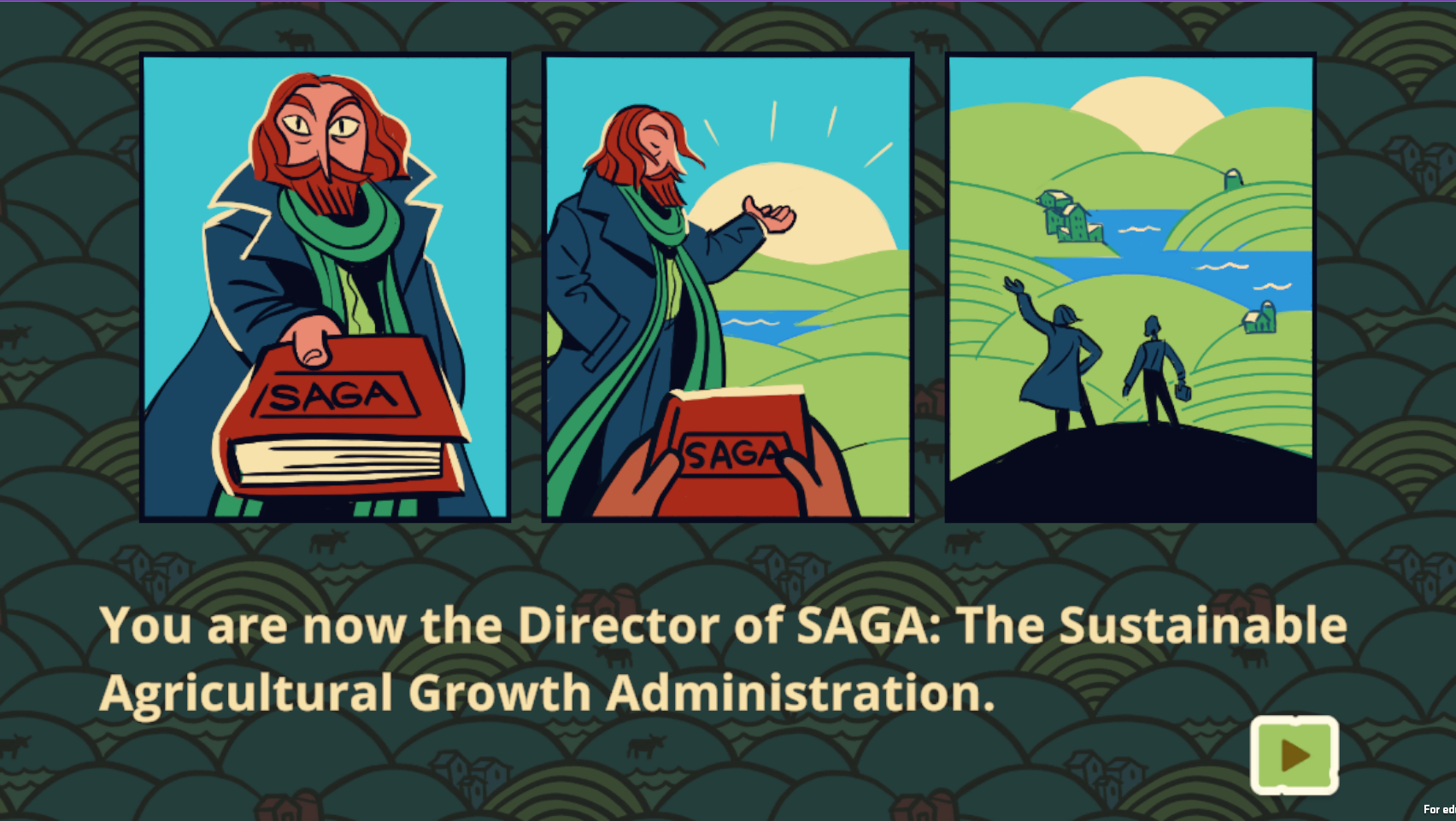 In Bloom: The Saga of the Poop Fertilizer Economy, players serve as the director of SAGA:The Sustainable Agricultural Growth Administration. In this role, their goal is to foster economic growth across five different counties while reducing agricultural runoff and gross algal blooms. To win, players must develop local trade networks, employ a range of economic and environmental policies, and balance the needs and perspectives of bickering townsfolk. A key focus of the game is learning about the relationship between agricultural runoff and water quality, while exploring how markets that allow farmers to sell excess manure can lead to cleaner water and economic sustainability.