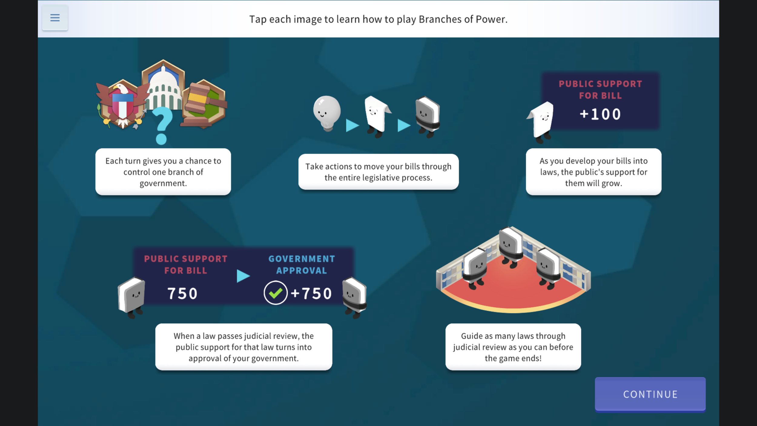 Each branch plays a specific role in turning an idea into a law. In Branches of Power, your students will practice their decision-making skills as they take on the roles and responsibilities of the Executive, Legislative, and Judicial Branches and turn as many bills into laws as possible. Through the game, players will introduce a presidential agenda, communicate with the public, write legislation, sign or veto bills, and even judge passed laws.