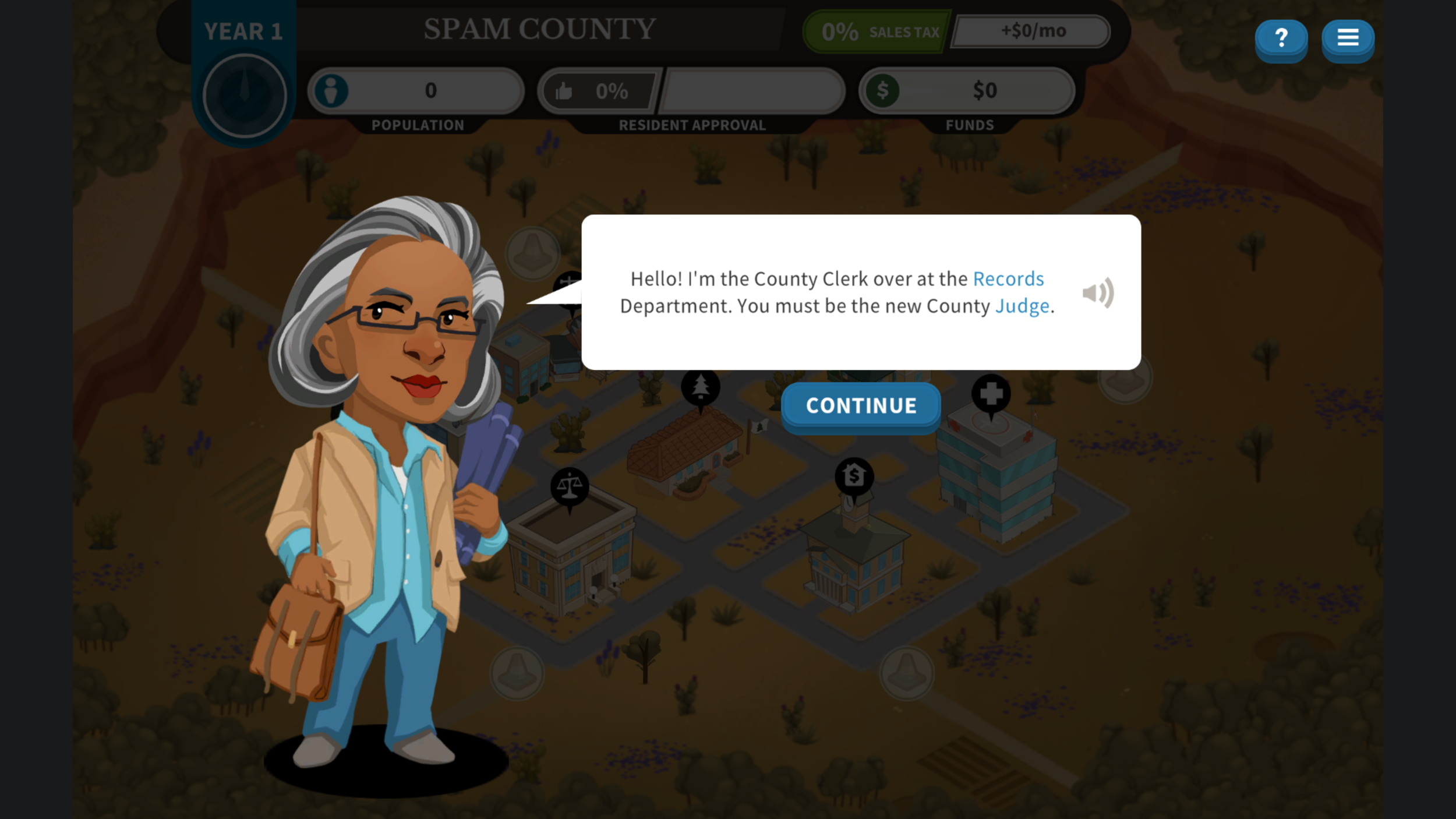 In Counties Work: Texas, students will discover what the Texas county government does while stepping into the role of a county official. Students will stay on top of resident requests, manage the annual budget through tax adjustments and spending choices, and address community crises that pop up along the way. Students will see what county departments have solutions as they work to balance the budget and keep citizens happy. -